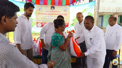 Volunteers and doctors attending to rural patients during a free medical camp under the “Sai Aarogya” initiative.