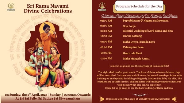 We lovingly invite you to attend the #RamaNavami celebrations at Sri Sathya Sai Divyaamritam on Sunday (6th April).